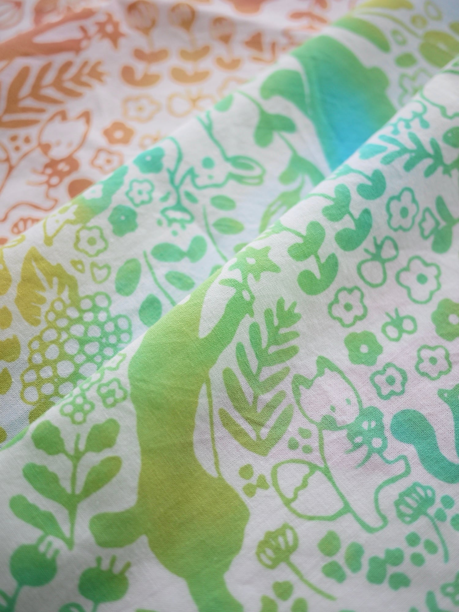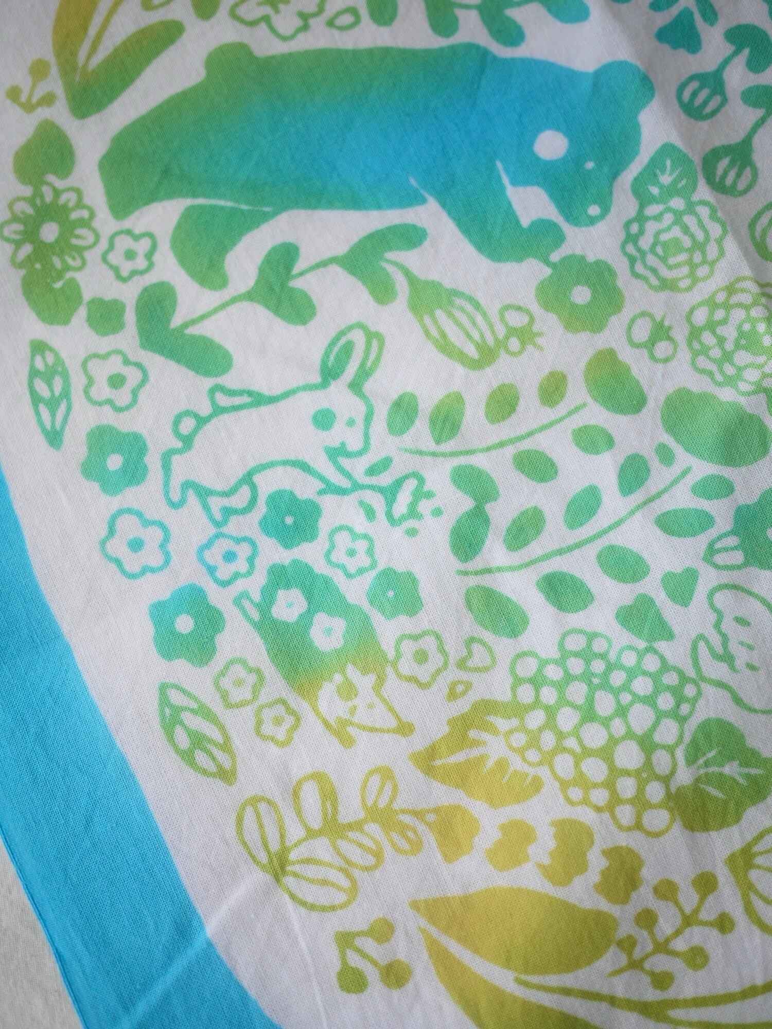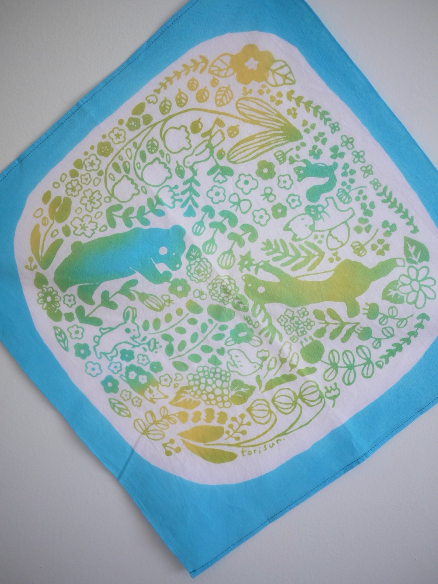 『注染』らしい色の揺らぎやぼかしは、どうぶつたちの素朴な可愛さを引き立てます。