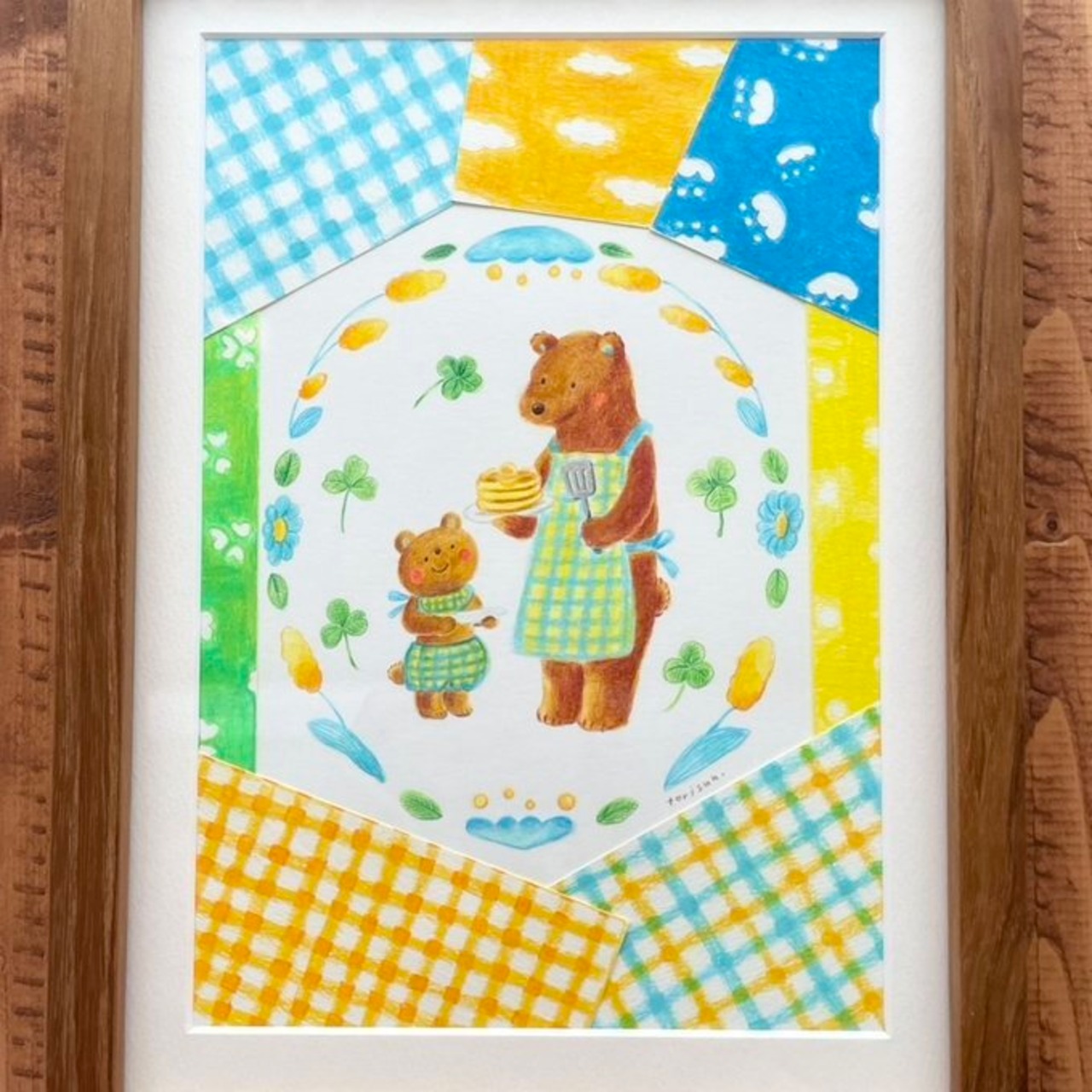 色鉛筆でじっくり塗り込んだ、いろんな柄を周りにコラージュしました。