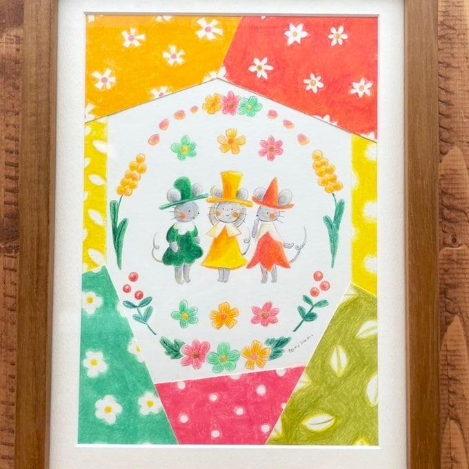 色鉛筆でじっくり塗り込んだ、いろんな柄を周りにコラージュしました。