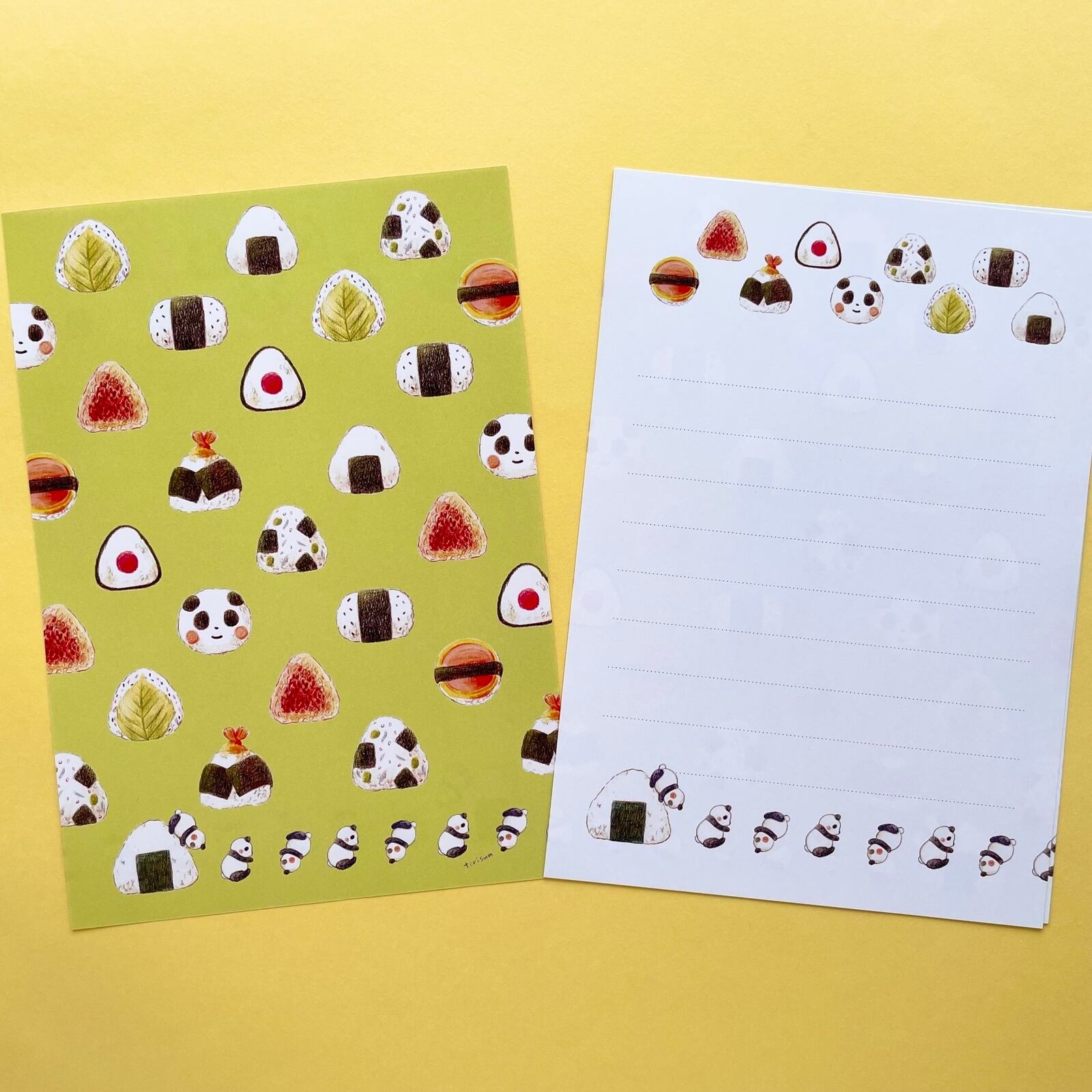 いろんなおにぎりの絵柄を描いた黄緑の背景の便箋の2種類。
