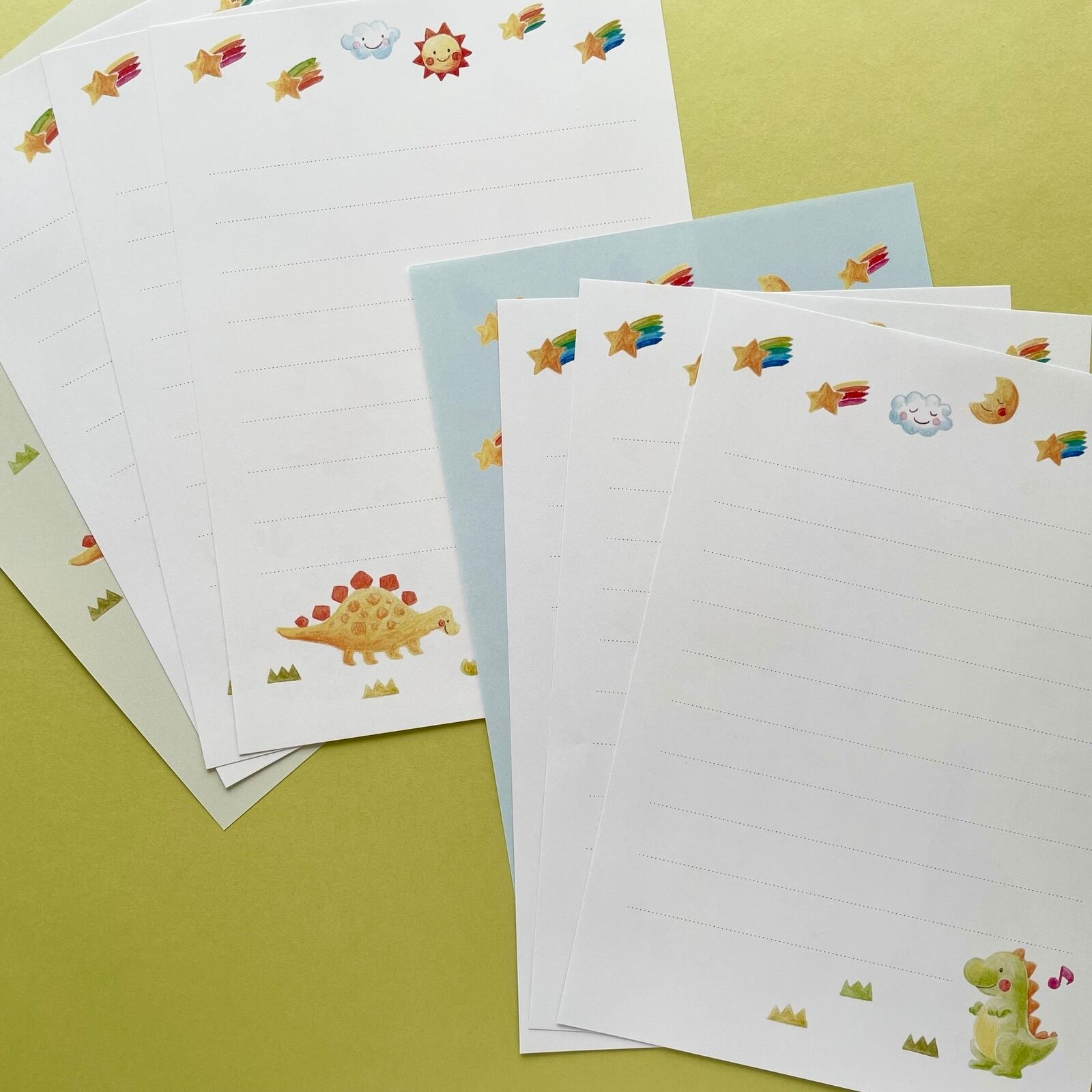 流星にお願いする恐竜たちと、たいようやお星さま、お月さまのかわいいレターセットです。
